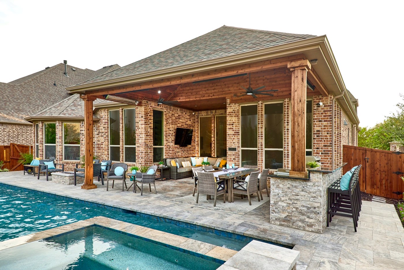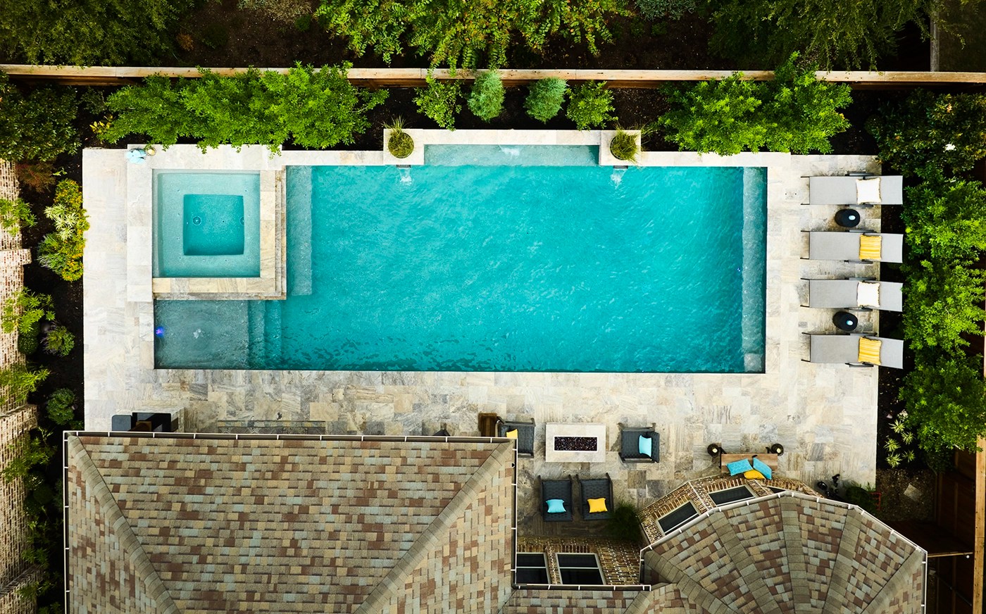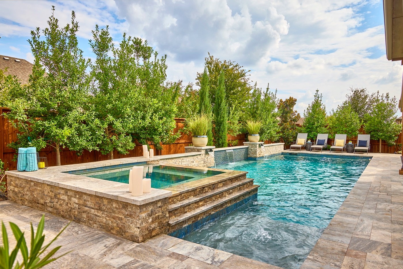 This project showcases a beautiful rectangular pool with a cozy corner spa, creating the perfect blend of relaxation and style. Surrounding the pool is a spacious paver patio, highlighted by a custom fire pit for added warmth and ambiance. A covered patio completes the space, offering shade and comfort, making it ideal for outdoor gatherings and year-round enjoyment.
